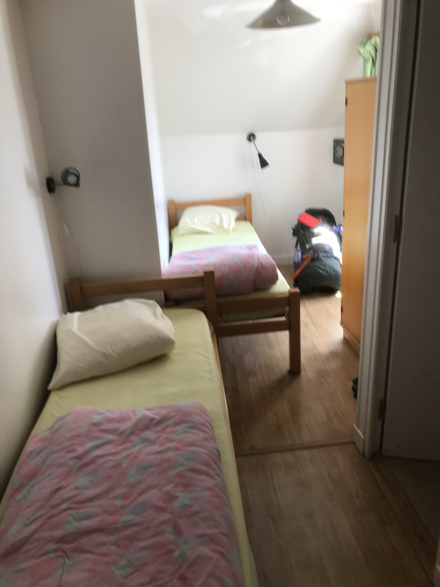Iets verderop staat een echte rood met geel gestreepte circustent. Wat is dit nu weer? De contactpersoon Olivier komt naar buiten en begeleidt mij naar de boerenhoeve. Dat is nu een soort jeugdherberg met 60 slaapplaatsen, een enorme keuken met lange tafels en een soort gemeenschappelijke ruimte met een oude piano. Hij zegt mij dat ik geluk heb: er zijn nu geen andere gasten en ik krijg een kamertje waarin twee kleine bedjes staan. Alle andere kamers zijn voor 6 of 8 personen (stapelbedden).